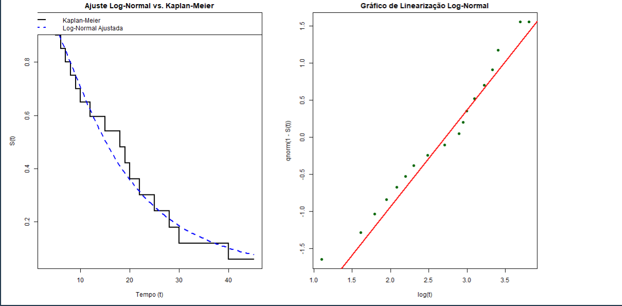 Portanto para que o modelo log-normal seja considerado apropriado, o gráfico \(\Phi^{-1}(\hat{S}(t))\) versus \(\log(t)\) deve ser aproximadamente linear com intercepto \(a=\mu/\sigma\), e inclinação \(b = -1/\sigma\).